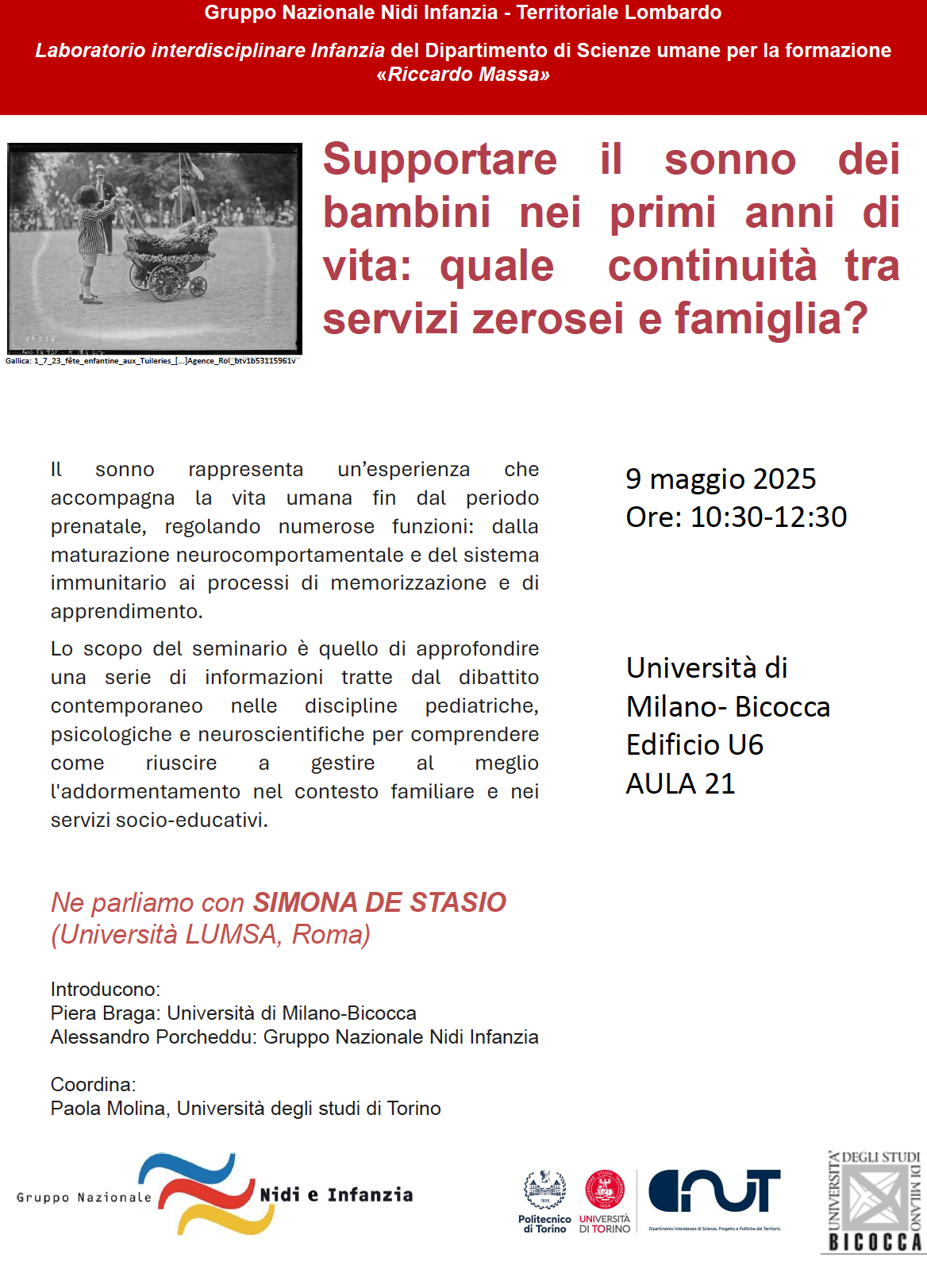 L’evento, promosso dal Gruppo Nazionale Nidi Infanzia – Territoriale Lombardo e dal Laboratorio Interdisciplinare Infanzia del Dipartimento di Scienze Umane per la Formazione “Riccardo Massa” dell’Università di Milano-Bicocca, tenutosi venerdì 9 maggio 2025, presso l’Università di Milano-Bicocca, si è proposto di approfondire il ruolo cruciale del sonno nello sviluppo infantile e l’importanza di una continuità educativa e relazionale tra il contesto familiare e i servizi per l’infanzia.